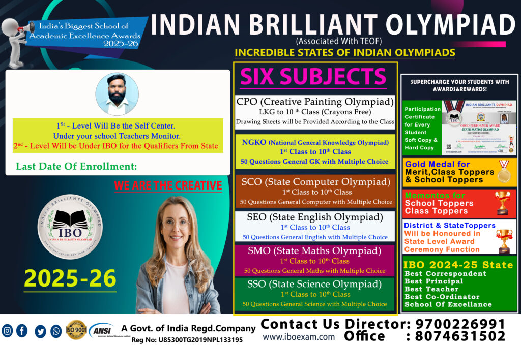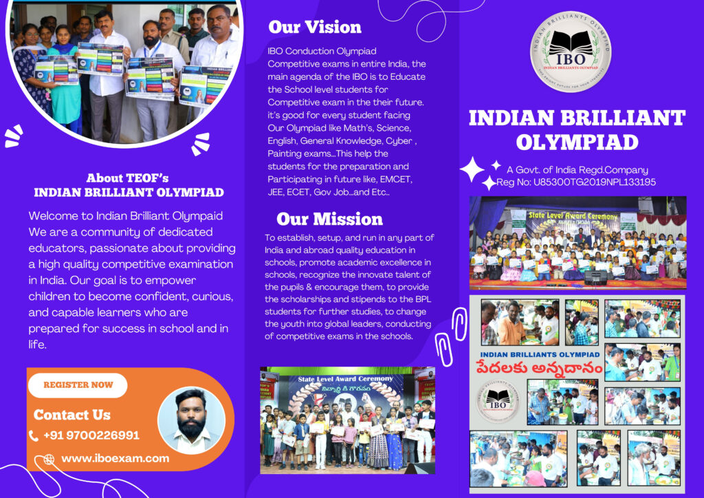 IBO Conduction Olympiad Competitive exams in entire India, the main agenda of the IBO is to Educate the School level students for Competitive exam in the their future. it’s good for every student facing Our Olympiad like Math’s, Science, English, General Knowledge, Cyber , Painting exams…This help the students for the preparation and Participating in future like, EMCET, JEE, ECET, Gov Job…and Etc..